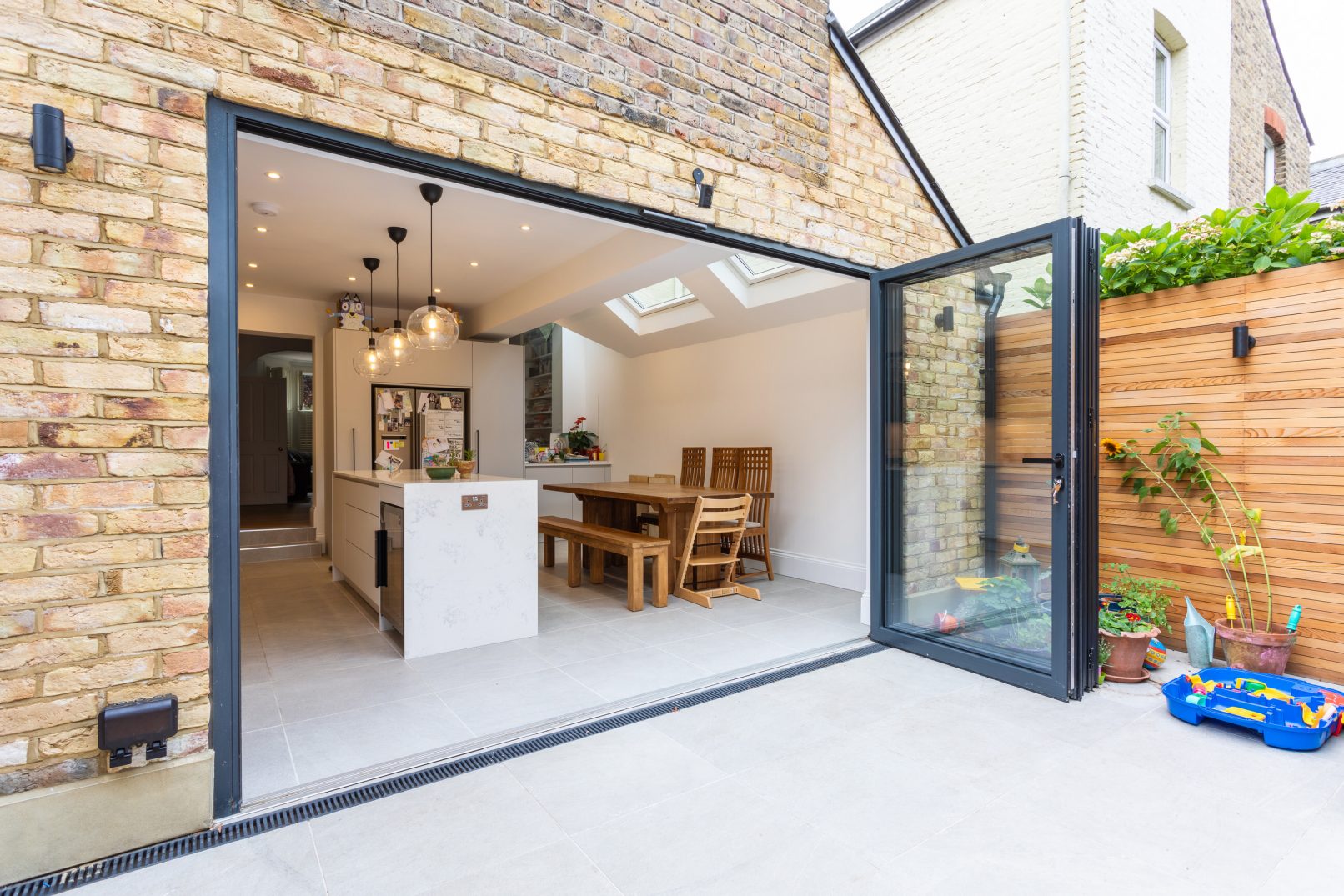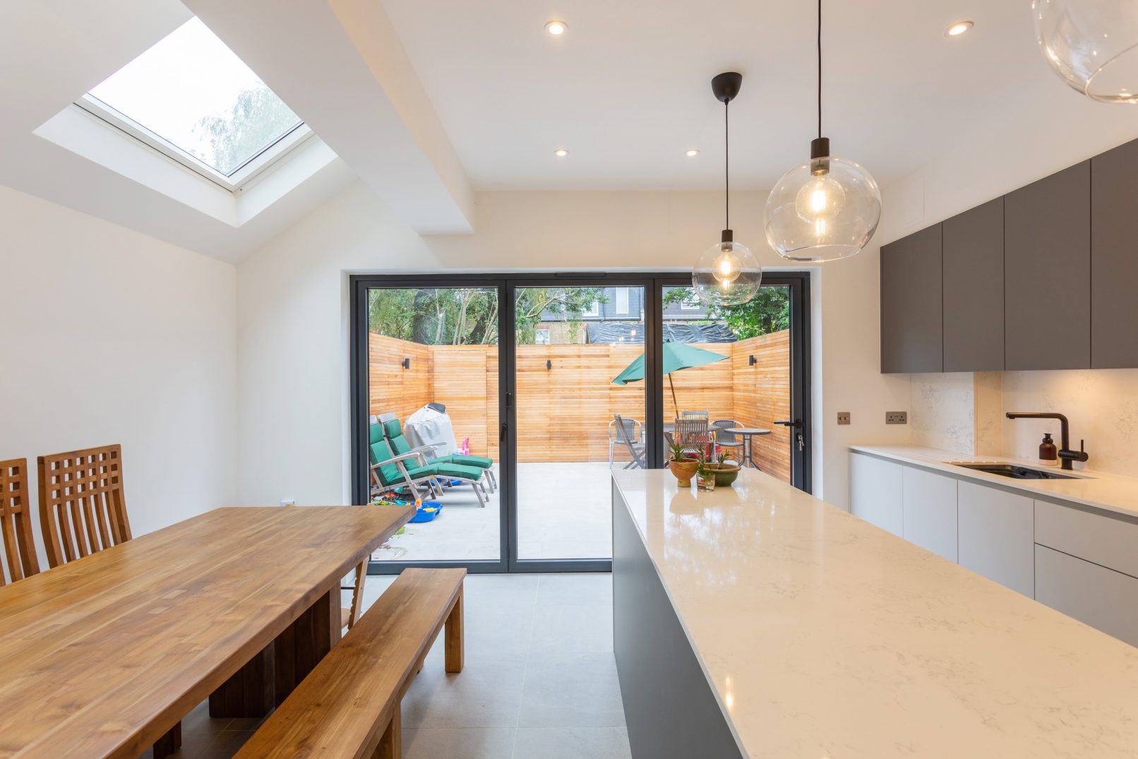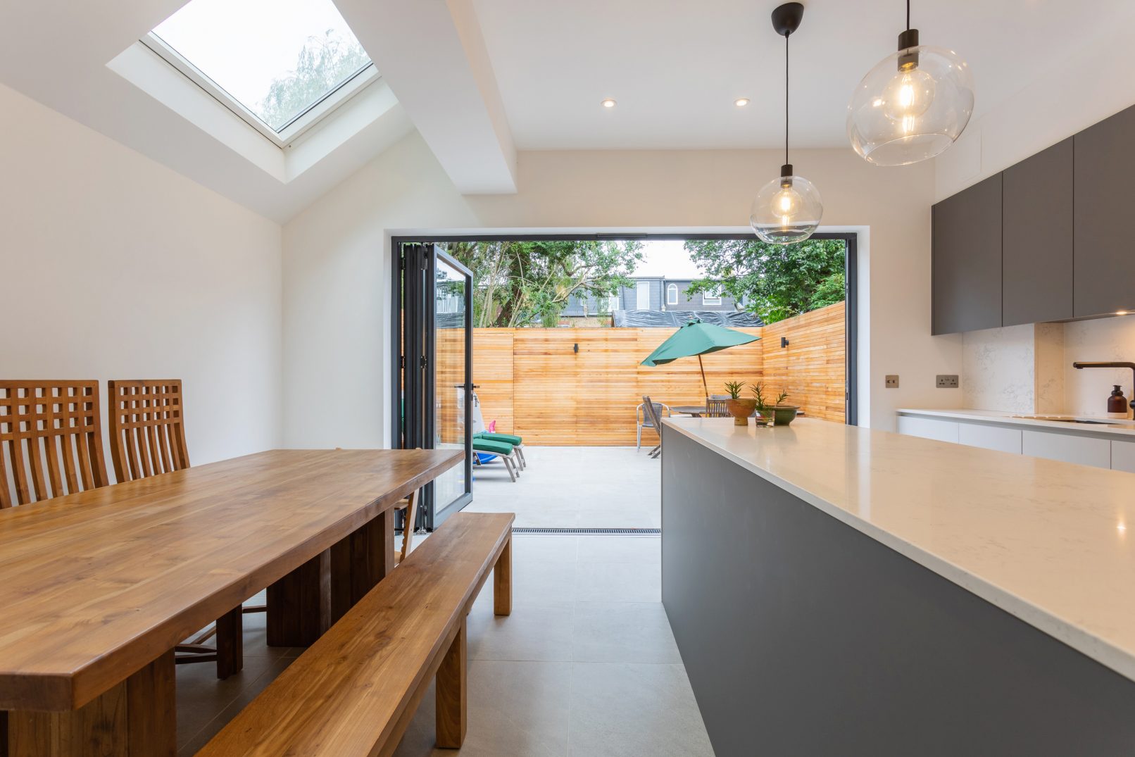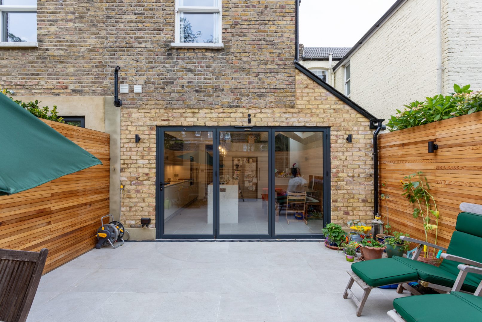 Rear extension / side infill with glass roof and rear garden patio and fencing
