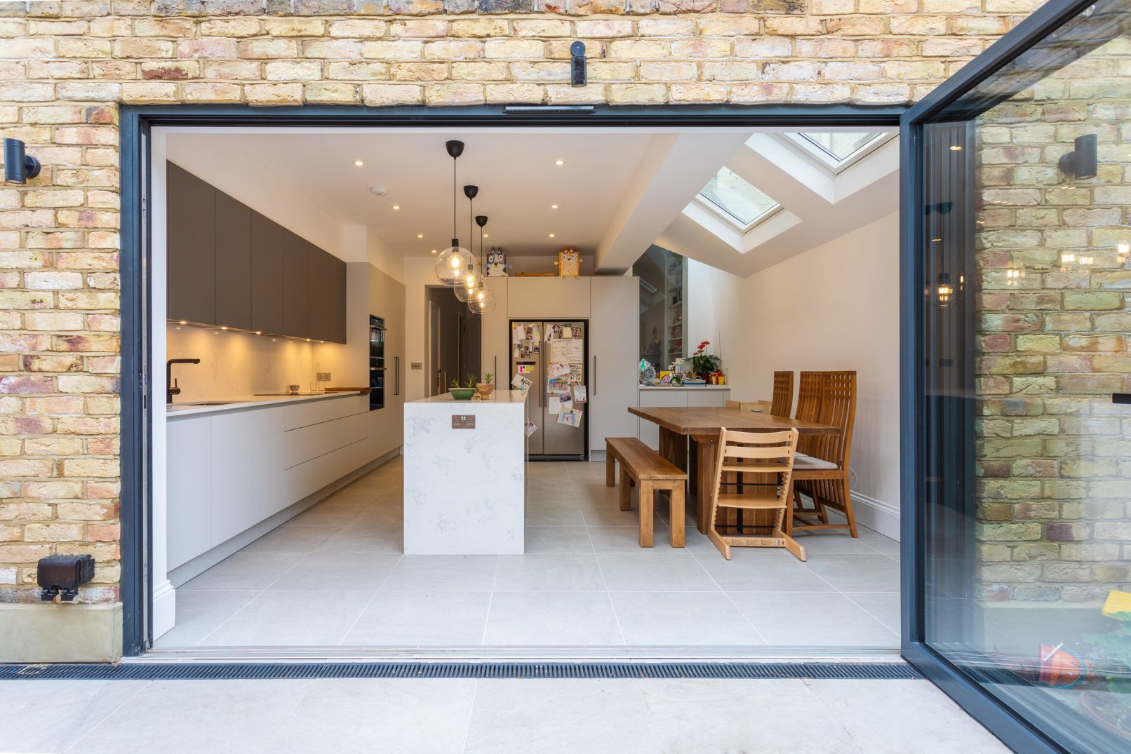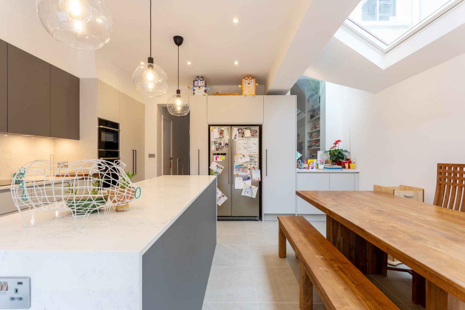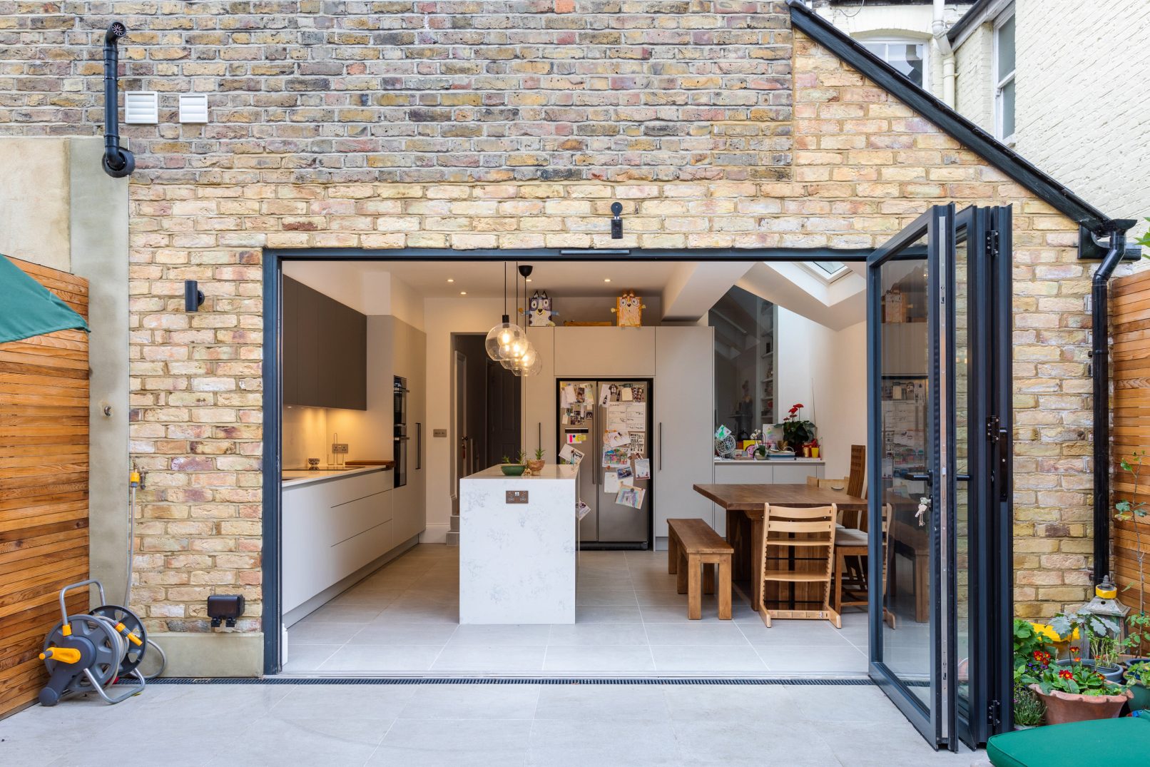 Rear extension / side infill with glass roof and rear garden patio and fencing