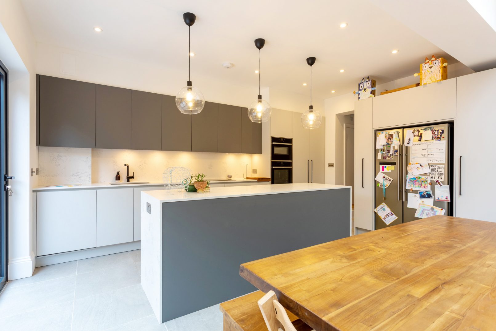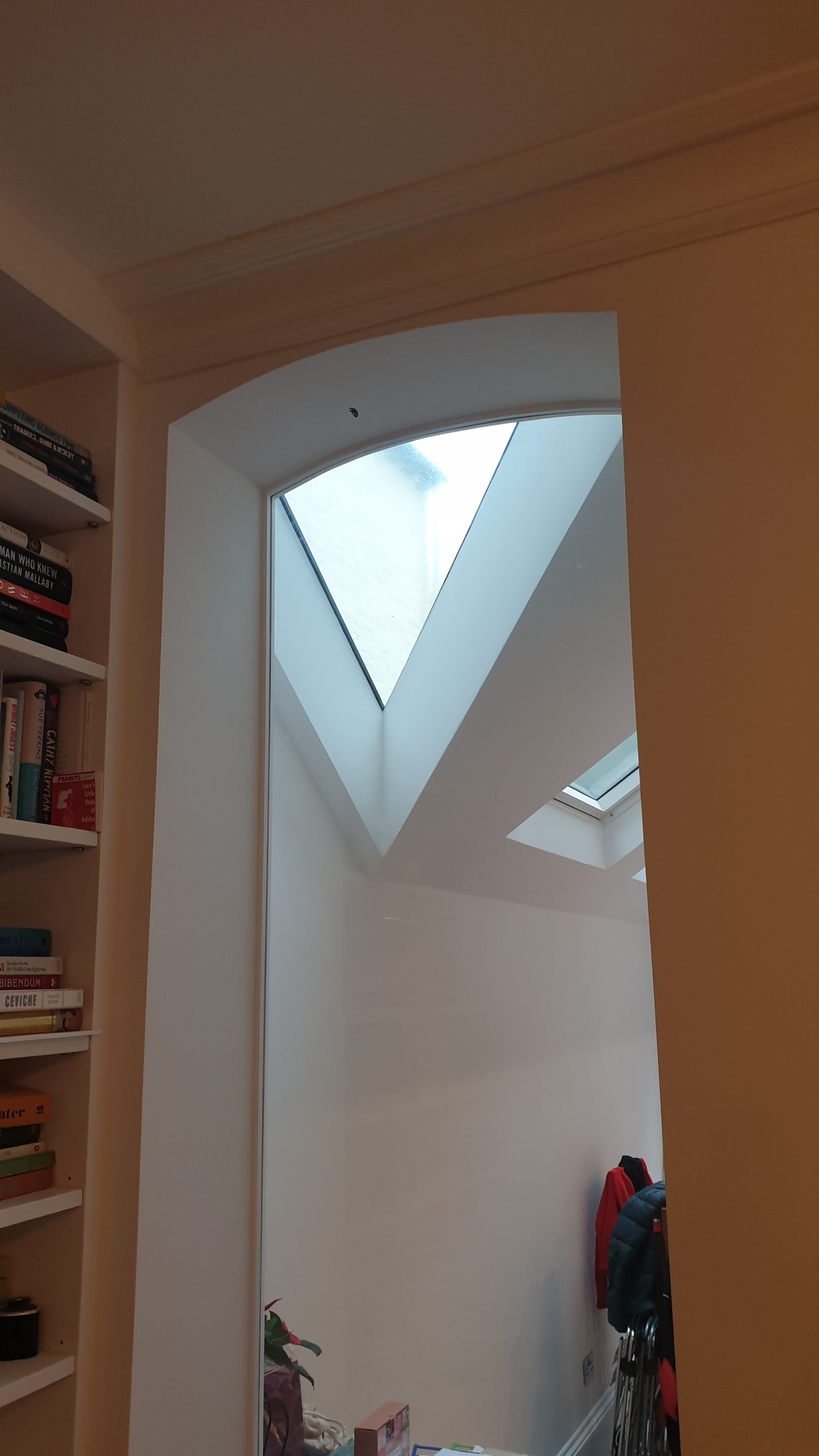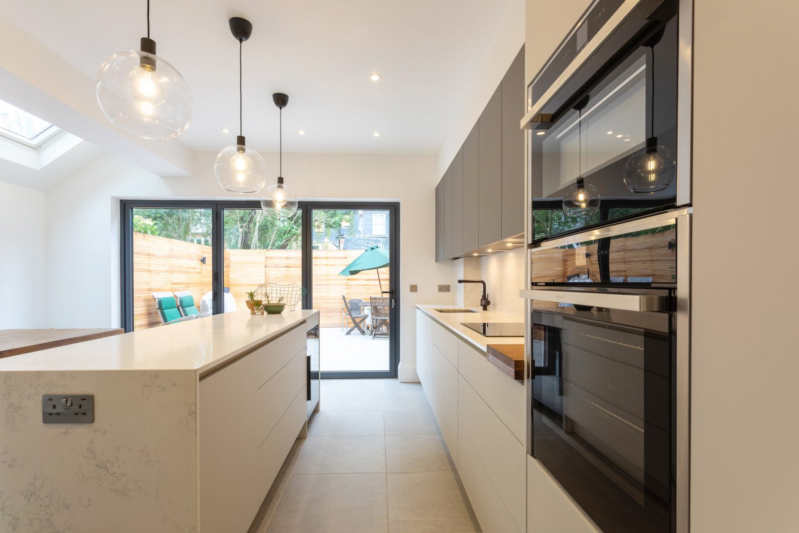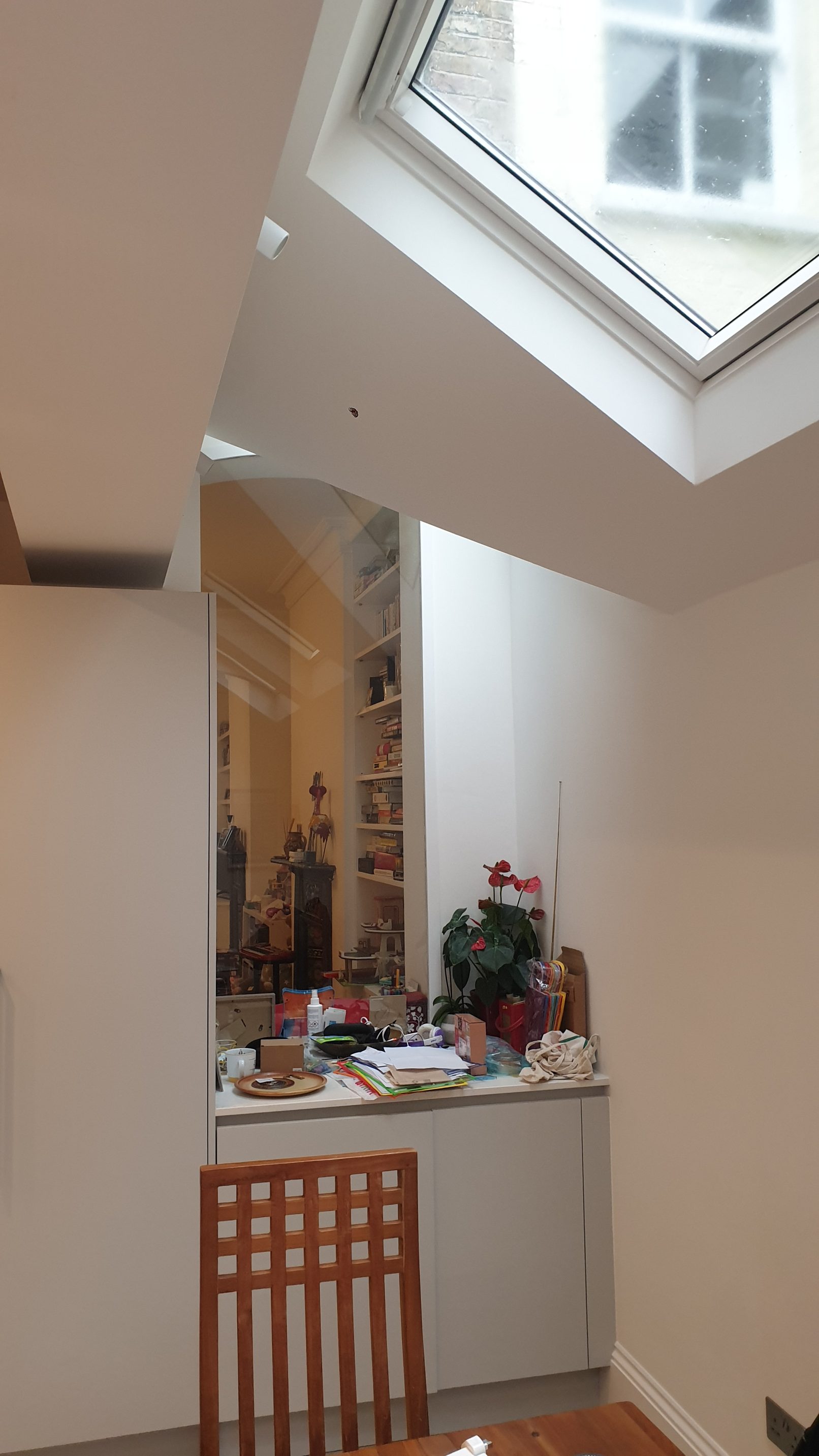 Rear extension / side infill with glass roof and rear garden patio and fencing
